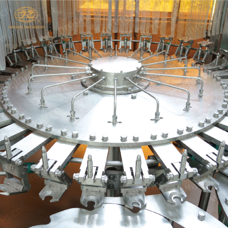 瓶子通過風(fēng)送道傳遞,然后通過撥瓶星輪傳送至三合一機(jī)的沖瓶機(jī)。回轉(zhuǎn)盤上瓶夾夾住瓶口沿一導(dǎo)軌翻轉(zhuǎn)180°,使瓶口向下。噴嘴噴沖瓶水,對(duì)瓶子內(nèi)壁進(jìn)行沖洗。瓶子經(jīng)沖洗、瀝干后在瓶夾夾持下沿導(dǎo)軌再翻轉(zhuǎn)180°,使瓶口向上。洗凈后的瓶子通過撥瓶星輪由沖瓶機(jī)導(dǎo)出并傳送至灌裝機(jī)。